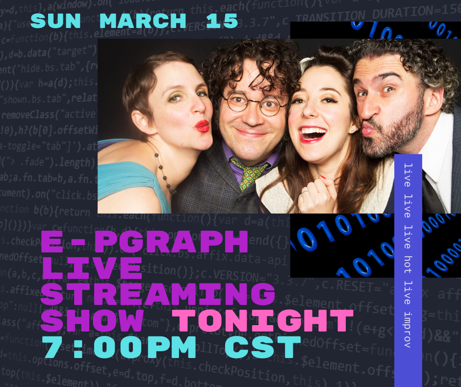 Join award-winning improv troupe Parallelogramophonograph for a virtual improv show. You stay at home, in your pajamas (maybe?!) and the members of PGraph perform for you live, on video.